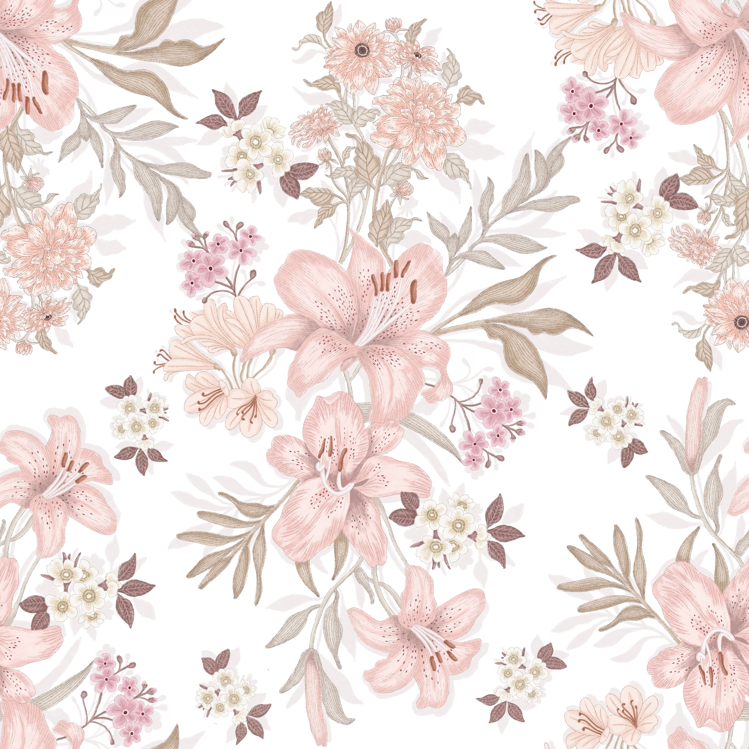 lilies and delicate garden florals. Blush pink petals, warm beige