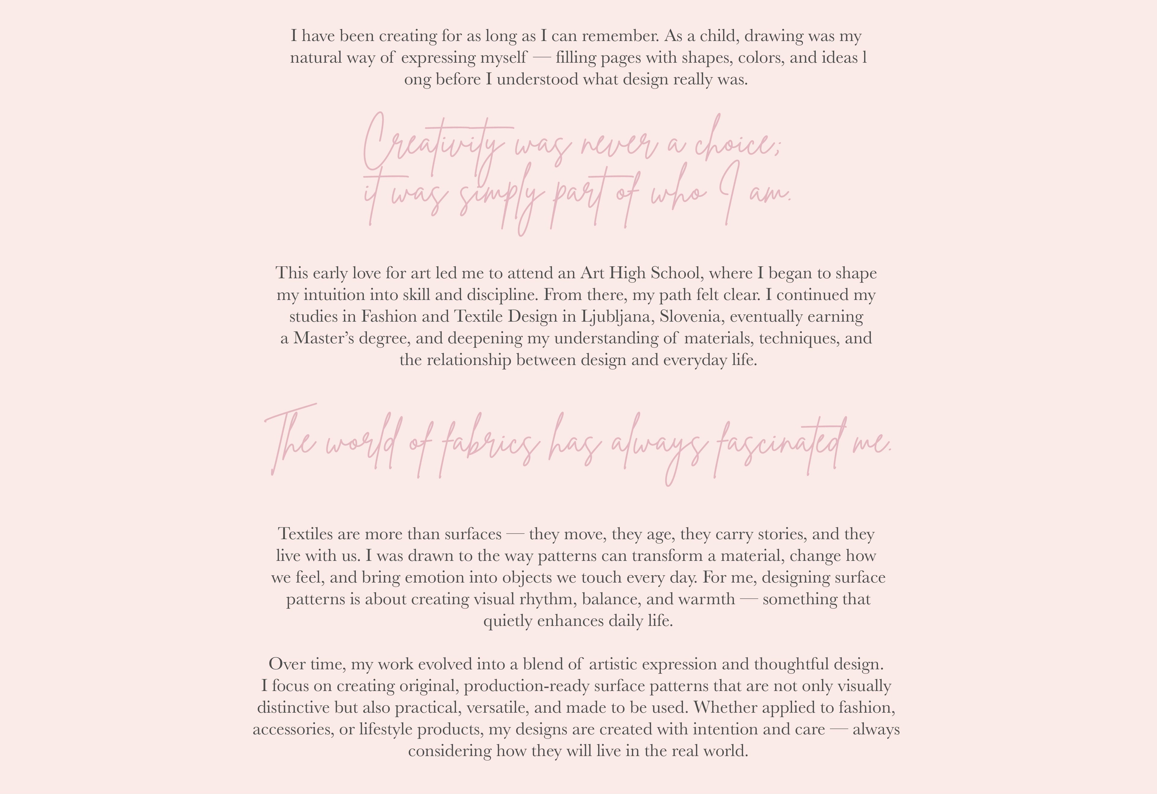 A surface textile designer creating original, production-ready patterns for fashion and lifestyle brands. My work is rooted in a love for color, texture, and storytelling — transforming everyday products into objects that evoke emotion, joy, and connection. Through thoughtful design and carefully crafteddetails, I help brands move beyond the ordinary and stand out with distinctive, meaningful patterns. Whether through licensing or custom collaborations, my goal is to bring visual richness, warmth, and personality into collections that people love to use and wear.I believe design has the power to brighten everyday life, inspire creativity, and turn the familiar into something memorable. Every pattern I create is designed with intention, quality, and real-world production in mind — ready to become part of your next collection.
